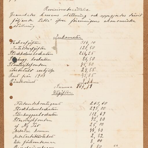 Gjutareförbundet avd 030 Uppsala - financial statement (1904)