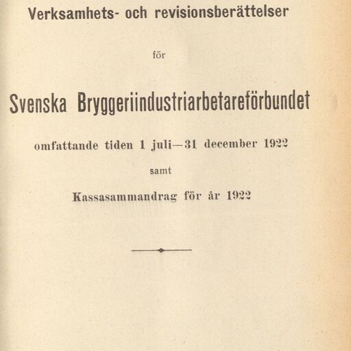 Verksamhets- och revisionsberättelser för Svenska Bryggeriindustriarbetareförbundet omfattande tiden 1 juli-31 december 1922 samt kassasammandrag för år 1922