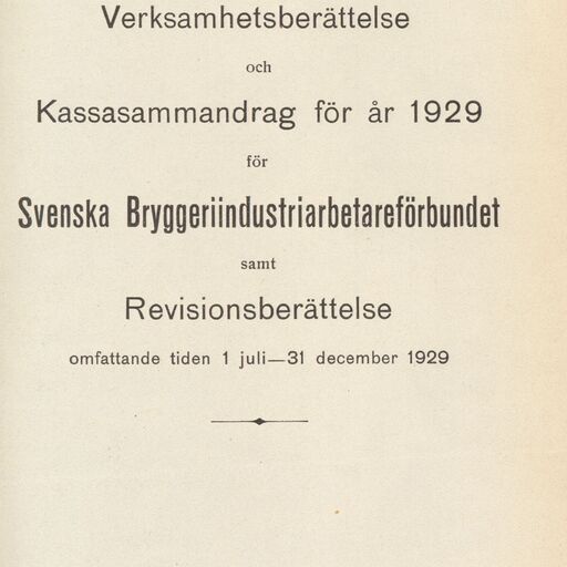 Verksamhetsberättelse och Kassasammandrag för år 1929 för Sv. Bryggeriindustriarbetareförbundet samt Revisionsberättelse omfattande tiden 1 juli-31 december 1929