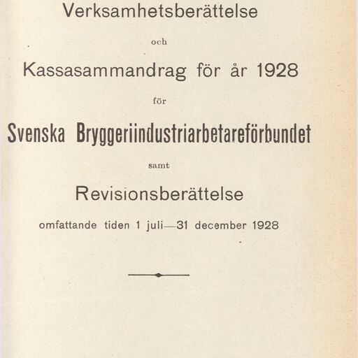 Verksamhetsberättelse och Kassasammandrag för år 1928 för Sv. Bryggeriindustriarbetareförbundet samt Revisionsberättelse omfattande tiden 1 juli-31 december 1928