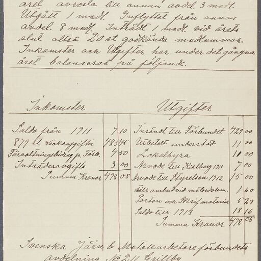 Metallindustriarbetareförbundet avd 211 Grillby - annual report (1912)