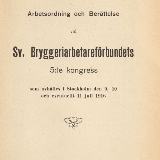 Arbetsordning och Berättelse vid Sv. Bryggeriindustriförbundets 5:te kongress som avhålles i Stockholm den 9, 10 och eventuellt 11 juni 1916