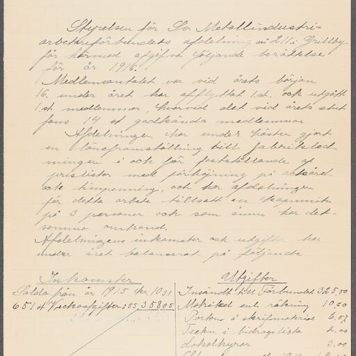 Metallindustriarbetareförbundet avd 211 Grillby - annual report (1916)