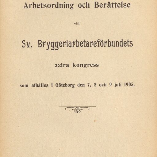 Arbetsordning och Berättelse vid Sv. Bryggeriarbetareförbundets 2:dra kongress som afhålles i Göteborg den 7, 8, och 9 juli 1905