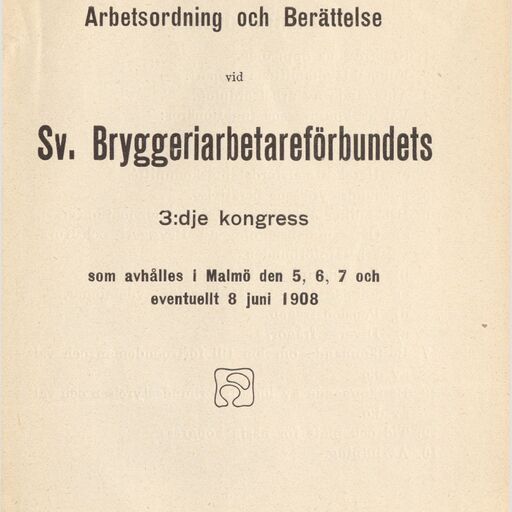 Arbetsordning och Berättelse vid Sv. Bryggeriindustriförbundets 3:e kongress som avhålles i Malmö den 5, 6, 7, och eventuellt 8 juni 1908